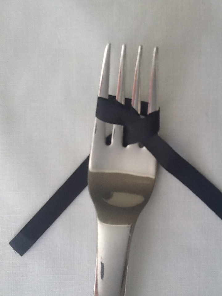 turn the fork over and tie the two ends with a single bow (pull the ribbon as tight as you can)